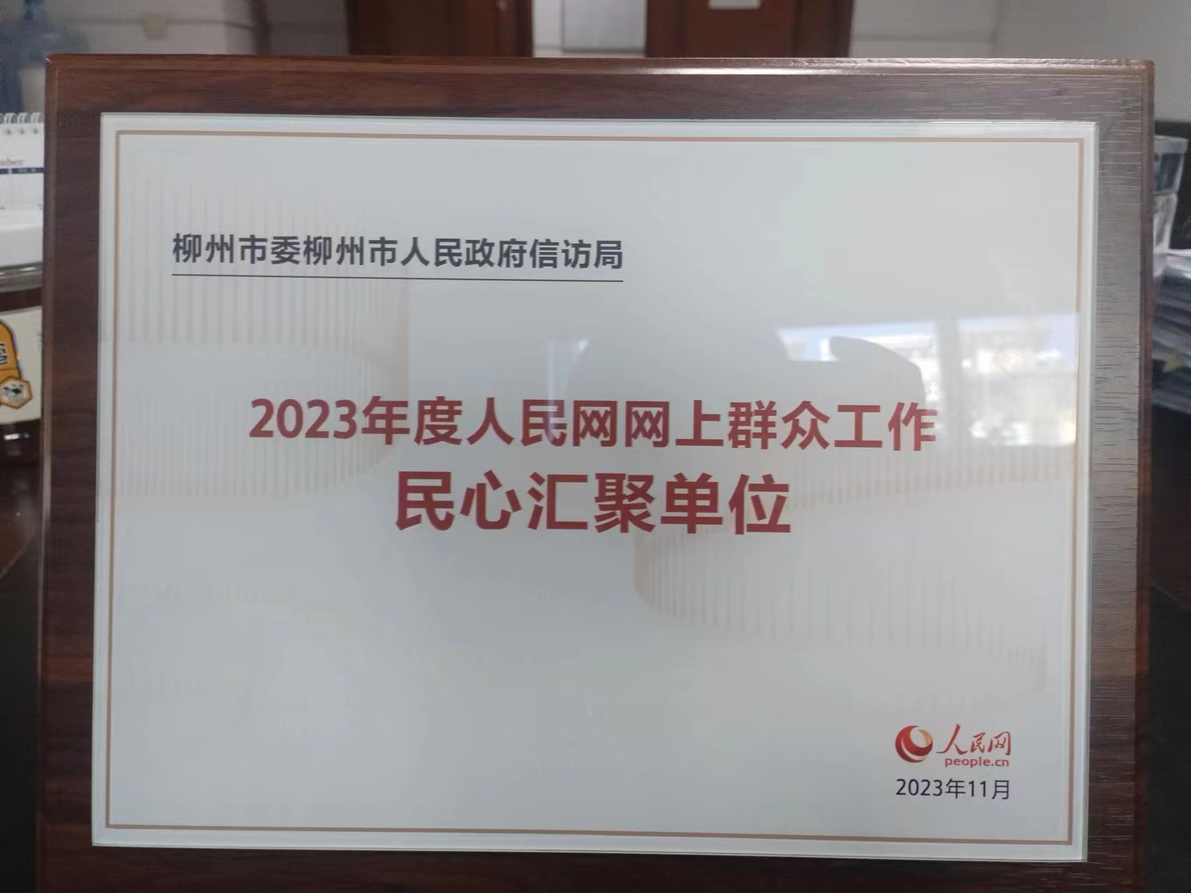 12月28日,人民网广西频道总编办副主任、新媒体部主任阮旭日为柳州市信访局授发“2023年度人民网网上群众工作民心汇聚单位”牌匾。