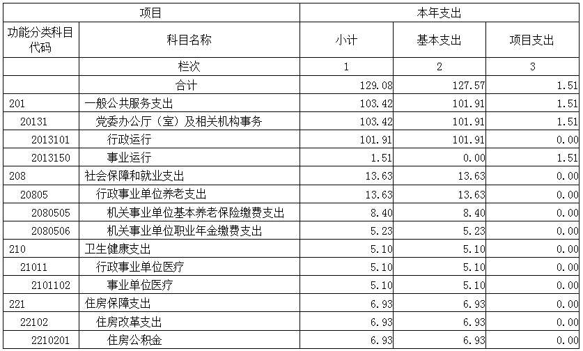 本单位2023年度一般公共预算财政拨款支出129.08万元,较 2022年度决算数增加24.96万元,增长23.97%。其中:基本支出 127.57万元,项目支出1.51万元。