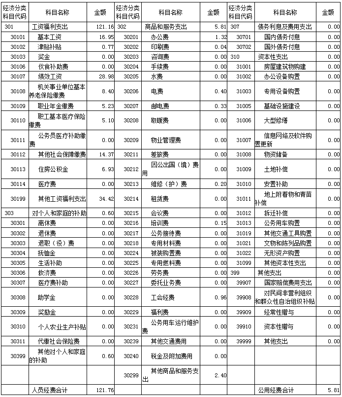 本单位2023年度一般公共预算财政拨款基本支出127.57万 元,其中:人员经费121.76万元,主要包括:基本工资、津贴补 贴、绩效工资、机关事业单位基本养老保险缴费、职业年金缴费、职工基本医疗保险缴费、其他社会保障缴费、住房公积金、 其他工资福利支出、其他对个人和家庭的补助;公用经费5.81万 元, 主要包括: 办公费、印刷费、电费、邮电费、维修(护) 费、培训费、工会经费、其他商品和服务支出。