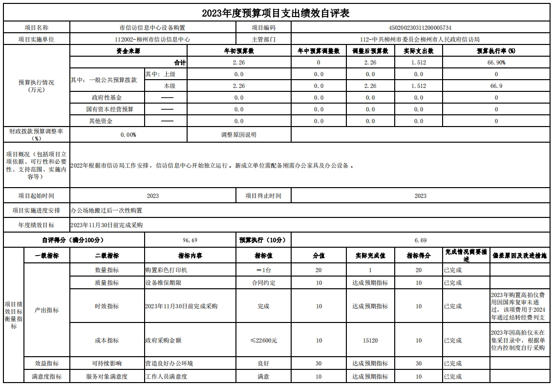 市信访信息中心设备购置项目自评综述:全年预算数2.26万 元,执行数1.51万元,执行率为66.9%, 自评得分为96.69分。项 目绩效目标总体完成情况良好,完成预期设定的绩效目标。发现 的主要问题及原因:对于一次性项目支出,预算执行效率和资金 使用效益不高。主要原因是因为工作人员学习培训预算绩效管理 工作不够深入,知识层面不够宽广,预算评价的制度不够健全。 下一步改进措施:加强对一次性项目支出的把控,将部门工作要 点与财政绩效目标紧密结合,提高预算执行效率和资金使用效益。